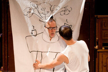 Deze drie elementen vormen één verhaal. Een tekening is niet zomaar een tekening: het kan een gieter zijn, een kip of iets heel anders, waarmee de spelers spelen alsof het écht is. Samen met het fysieke spel en de geluidseffecten ontstaat zo een fantasierijke theatervoorstelling.